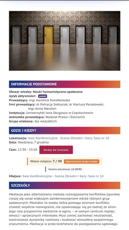 Pracownicy Wydziału Prawa i Ekonomii UJD, dr Patrycja Sołtysiak, dr Mariusz Paradowski, radca prawny Karolina Kwiatkowska oraz doktorantka mgr Anna Warston zaprezentowali podczas wydarzenia prelekcję pt. „Siedząc w ogniu. O roli mediatora w rozwiązywaniu konfliktów”. W jej trakcie omówili znaczenie mediacji jako narzędzia pozwalającego konstruktywnie przechodzić przez spór oraz budować trwałe porozumienia między stronami. Podkreślono wyjątkową rolę mediatora, który – niczym osoba „siedząca w ogniu” konfliktu – potrafi zachować neutralność, uważność i wrażliwość na emocje uczestników.