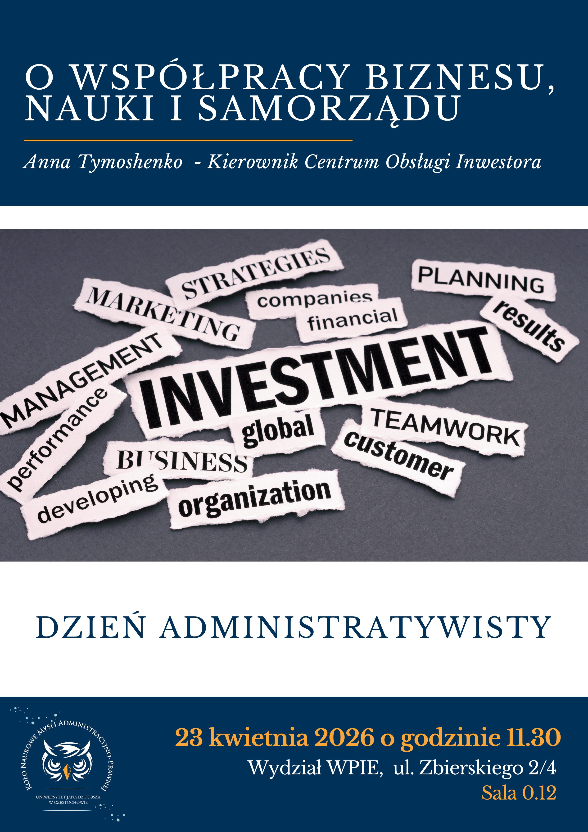 Z okazji Dnia Administratywisty Koło Naukowe Myśli Administracyjno-Prawnej ma przyjemność zaprosić wszystkich studentów na wyjątkowe wydarzenie poświęcone współpracy pomiędzy biznesem, nauką i samorządem.