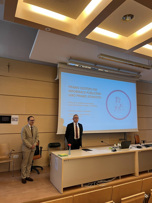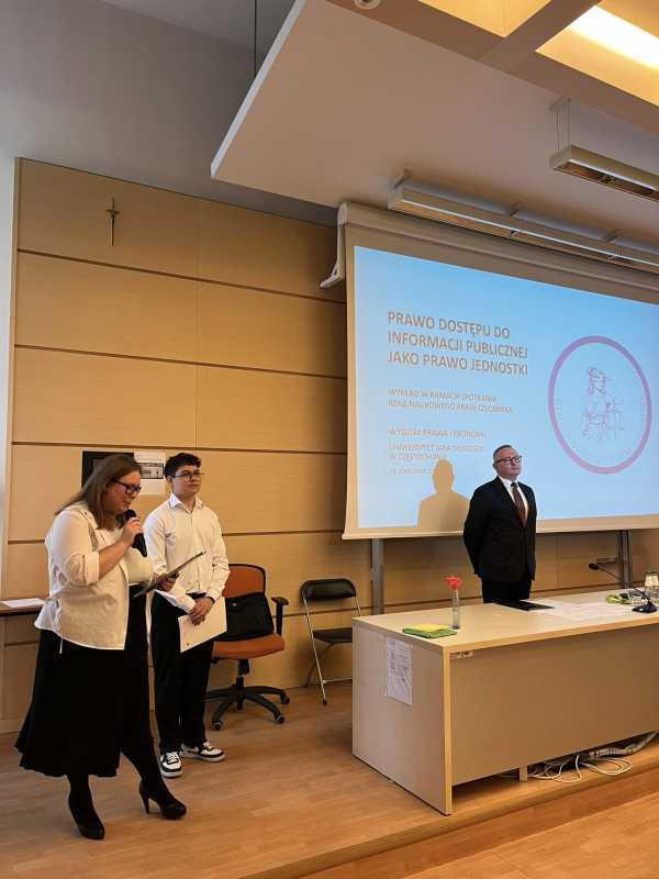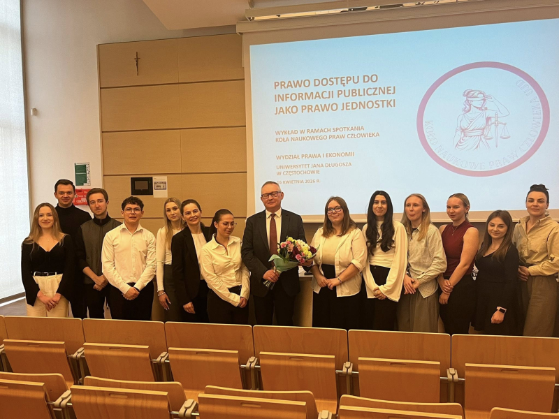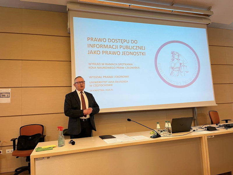 W dniu 16 kwietnia 2026 r. na Wydziale Prawa i Ekonomii Uniwersytetu Jana Długosza w Częstochowie odbył się wykład Prezesa Samorządowego Kolegium Odwoławczego w Częstochowie Piotra Palutka pt. „Prawo dostępu do informacji publicznej jako prawo jednostki” . Wykład ten został zorganizowany przez Koło Naukowe Praw Człowieka wraz z jego opiekunem naukowym dr Anną Deryng-Dziuk. Otwarcia spotkania z udziałem licznie przybyłych Studentów i zaproszonych gości dokonali w imieniu Zarządu Koła Naukowego Praw Człowieka (dalej jako: „KNPCz”) Przewodnicząca – Patrycja Błaszak oraz Zastępca – Olaf Cieślak. Przedstawiciele Zarządu KNPCz przybliżyli także aktywność Koła Naukowego Praw Człowieka, jak również cele organizacji.