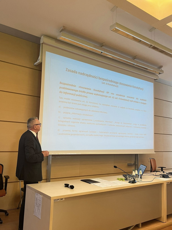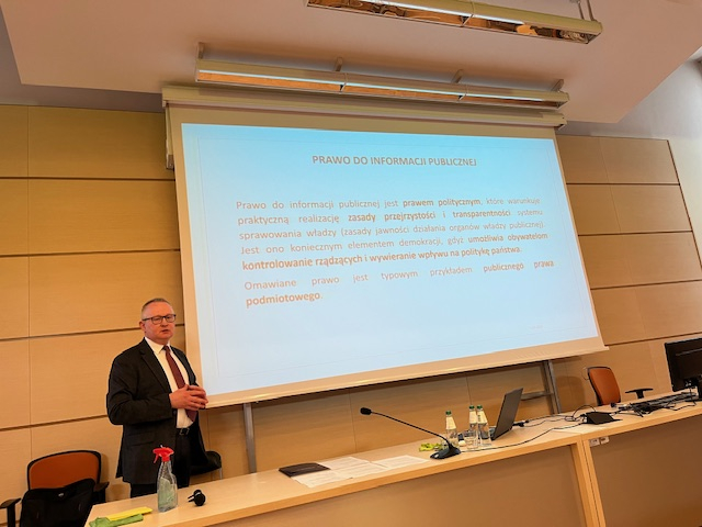 W dalszej kolejności głos zabrał Prezes Samorządowego Kolegium Odwoławczego w Częstochowie Piotr Palutek przedstawiając wykład pt. „Prawo dostępu do informacji publicznej jako prawo jednostki”. W pierwszej części swojego wystąpienia zaproszony Gość przedstawił istotę, genezę oraz rozwój praw człowieka, wskazując na znaczenie przyrodzonej godności człowieka przynależnej każdej jednostce ludzkiej. Wyróżnił także kategorie praw jednostki tj. prawa i wolności osobiste, prawa i wolności polityczne, prawa ekonomiczne, socjalne i kulturalne oraz wolności i prawa sądowe. Zaproszony Gość zauważył jednocześnie, że prawo do informacji publicznej jest prawem politycznym, które warunkuje praktyczną realizację zasady przejrzystości i transparentności systemu sprawowania władzy (zasady jawności działania organów władzy publicznej). W drugiej części wykładu omówił prawo do informacji w prawie międzynarodowym oraz Unii Europejskiej, by przejść do omówienia prawa do informacji publicznej w Konstytucji Rzeczypospolitej Polskiej (dalej jako: „Konstytucja RP”) ( tj. art. 61 Konstytucji RP) i ustawy o dostępnie do informacji publicznej (dalej jako: „u.d.i.p.”). Poddał analizie zakres podmiotowy i przedmiotowy u.d.i.p., podmioty zobowiązane do udostępnienia informacji publicznej, jak również wyjaśnił czym jest informacja publiczna, formy udostępniania informacji publicznej, odmowę udzielenia informacji publicznej, informację przetworzoną. W podsumowaniu zwrócił uwagę na nadużywanie prawa do dostępu do informacji publicznej jako próbę korzystania z instytucji dostępu do informacji publicznej dla osiągnięcia innego celu, aniżeli troska o dobro publiczne.