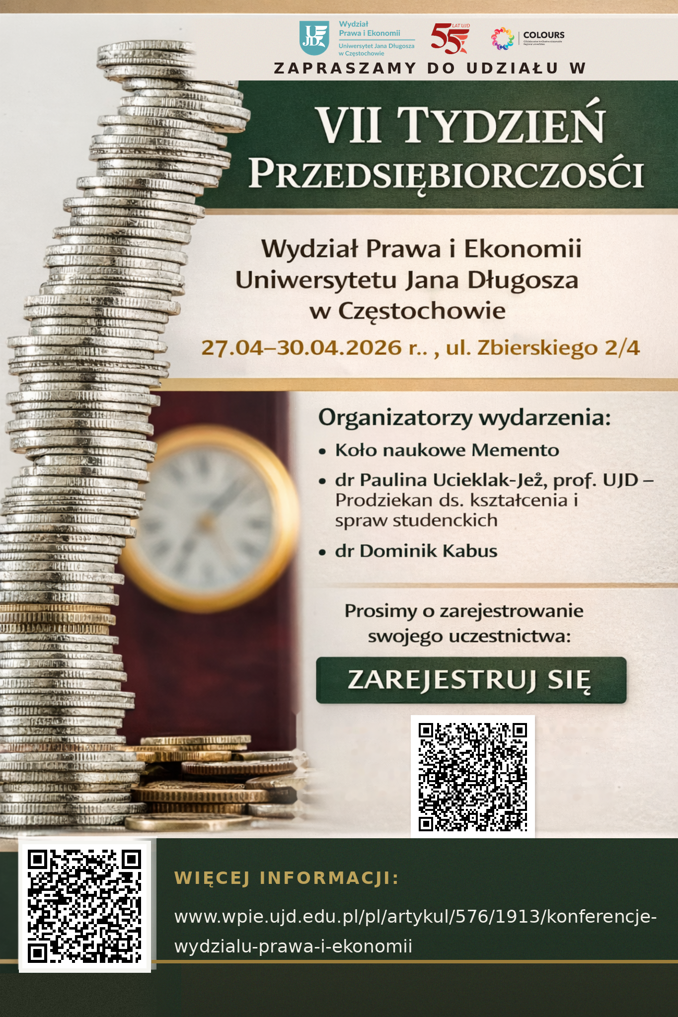 Serdecznie zapraszamy wszystkich studentów oraz uczniów szkół ponadpodstawowych do udziału w VII Tygodniu Przedsiębiorczości, który odbędzie się na Wydziale Prawa i Ekonomii Uniwersytetu Jana Długosza w Częstochowie w dniach 27.04–30.04.2026 r., przy ul. Zbierskiego 2/4.